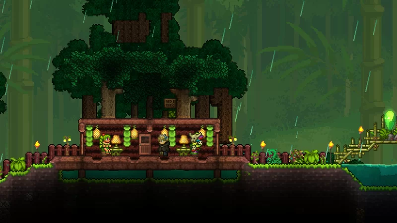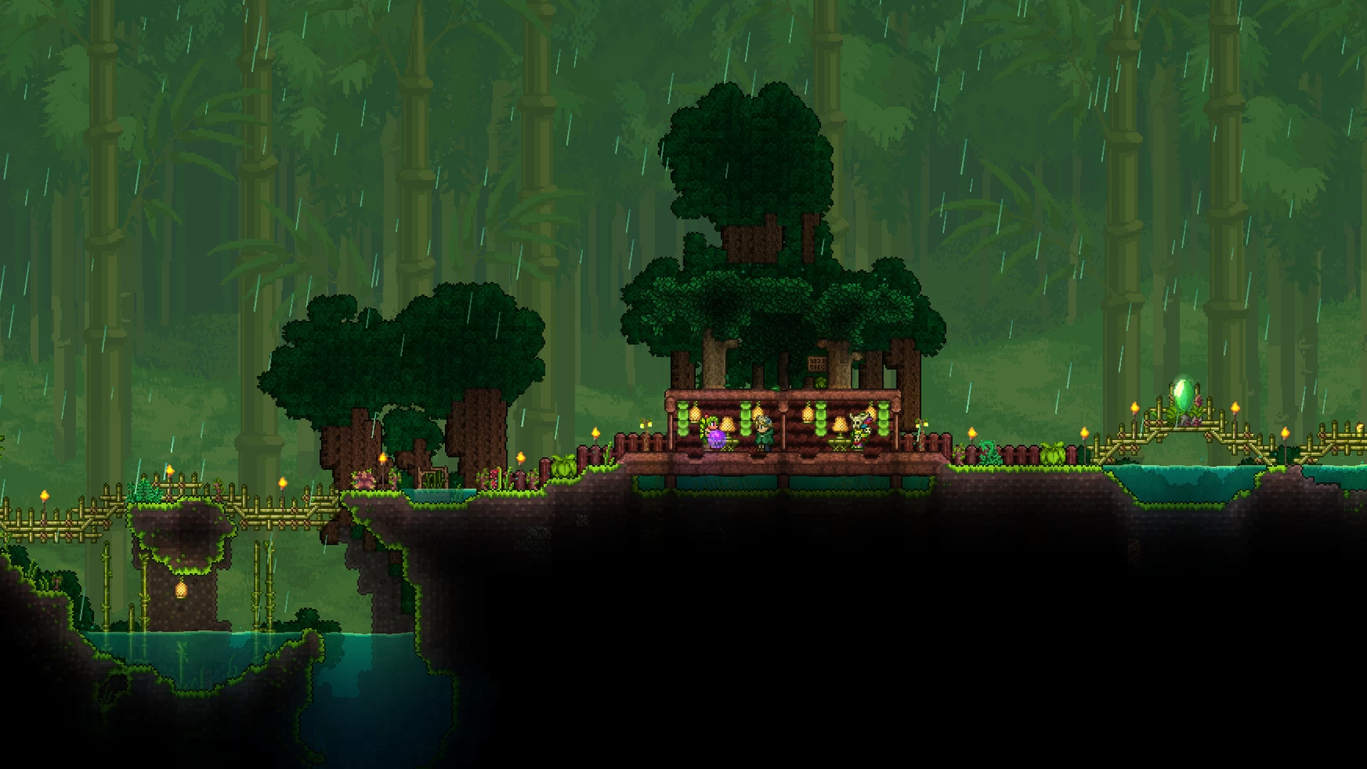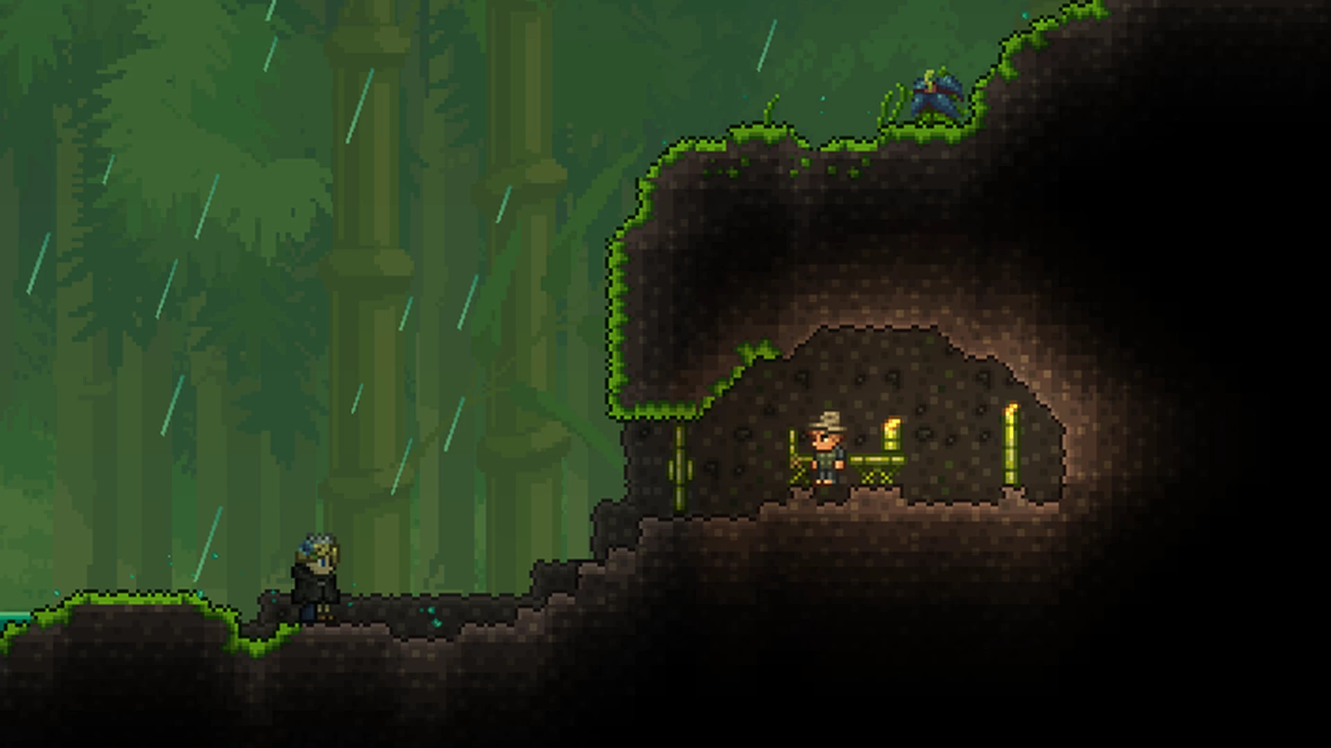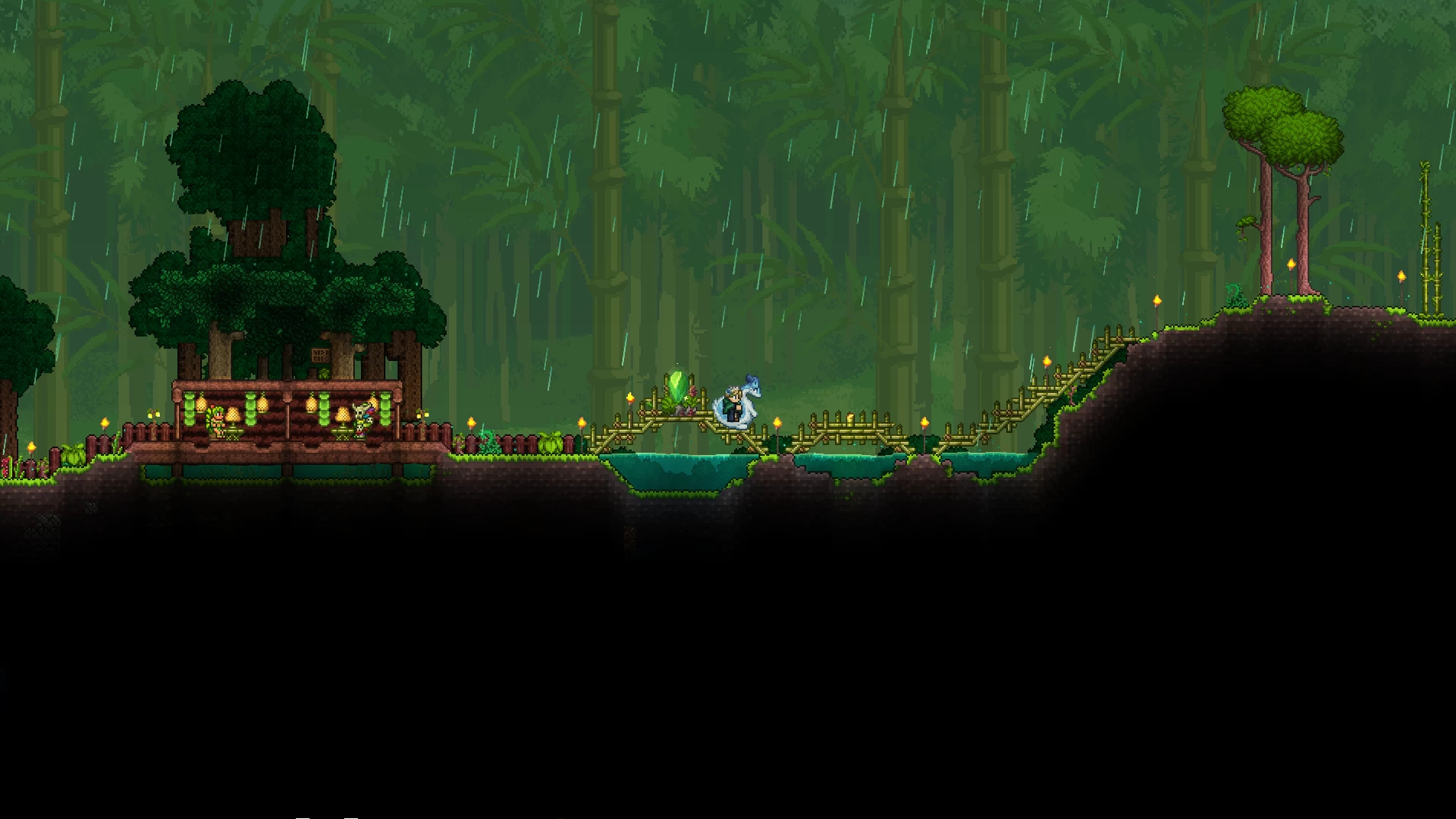 I made a cool jungle house in my new 1.4.5 world that I made because I cant do tModloader on 1.4.5 so I made a new world to play with my brother (did you know pc and mobile can crossplay?)