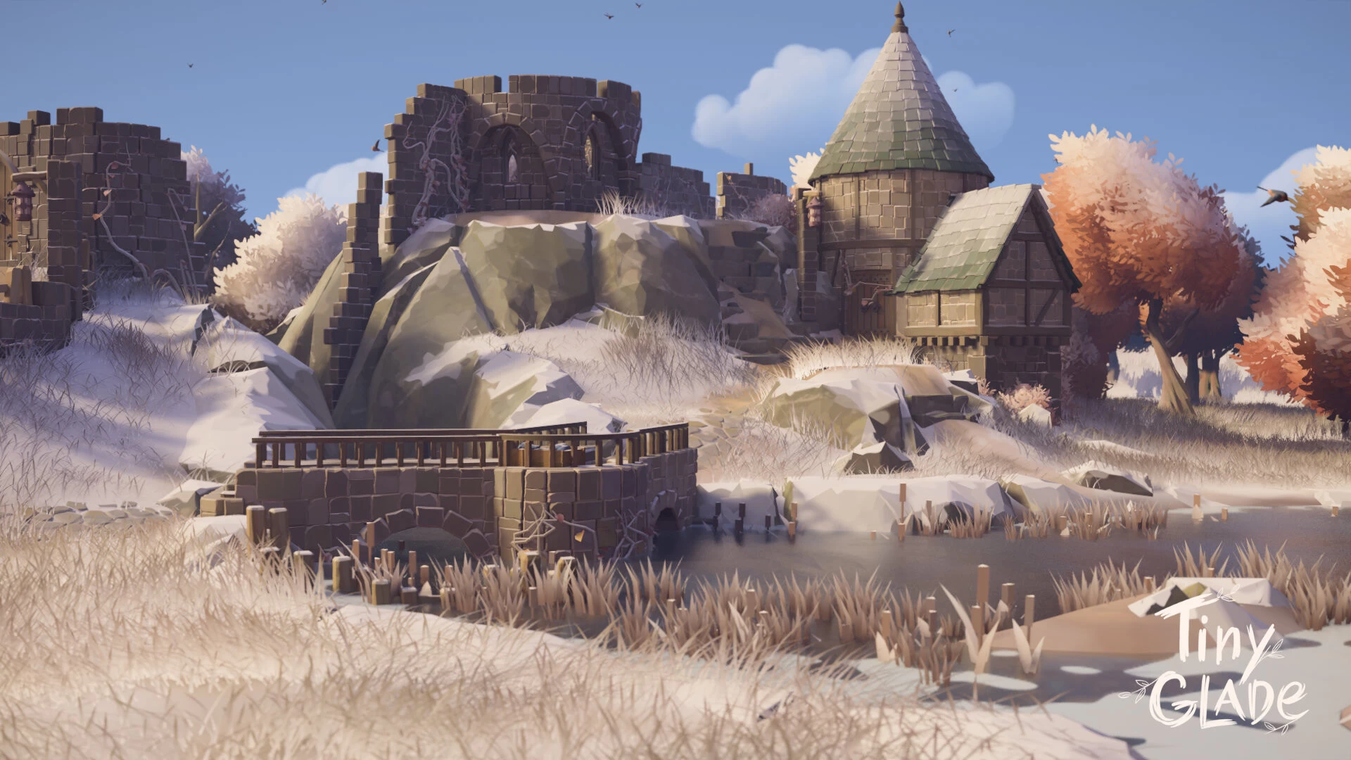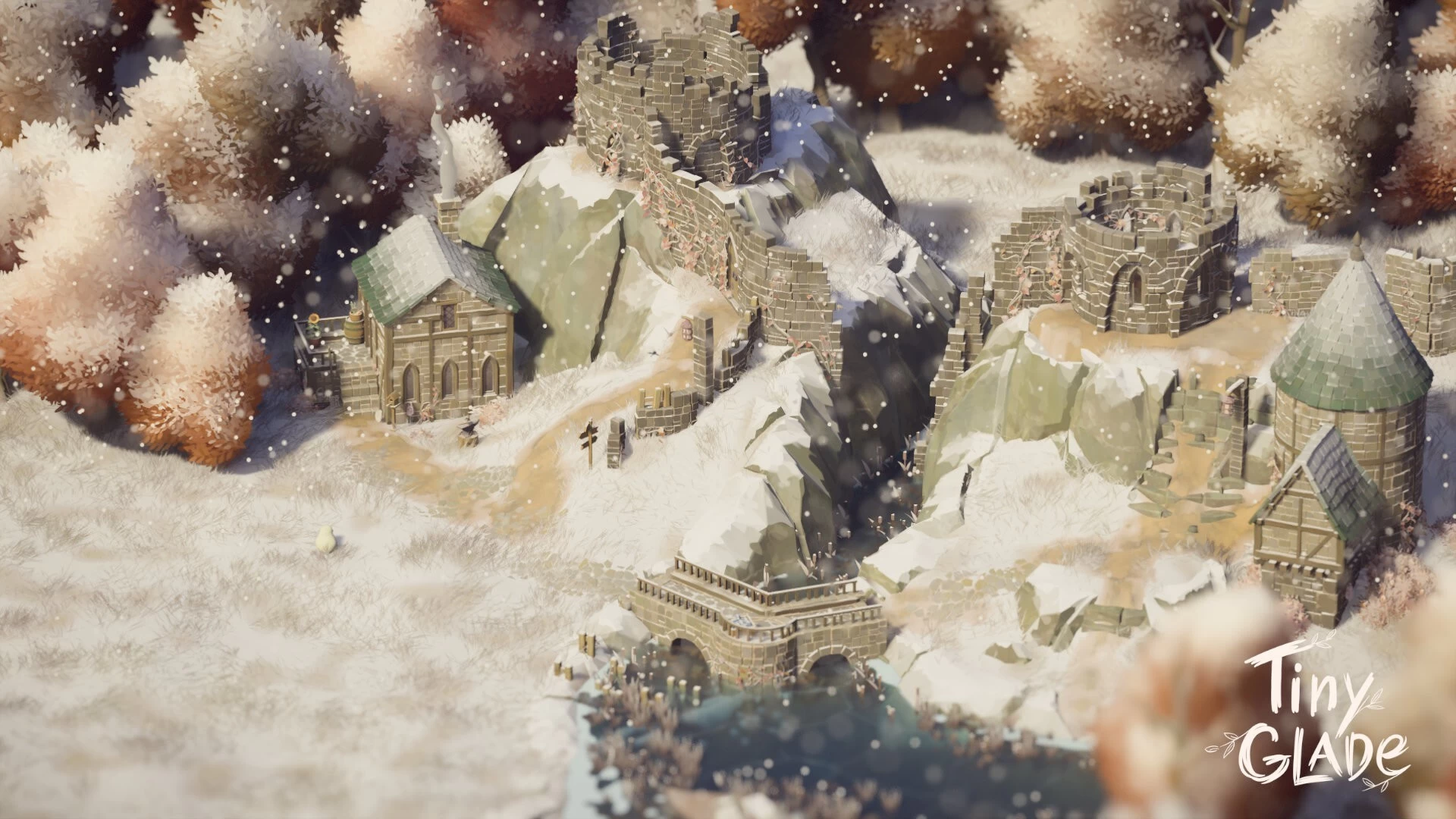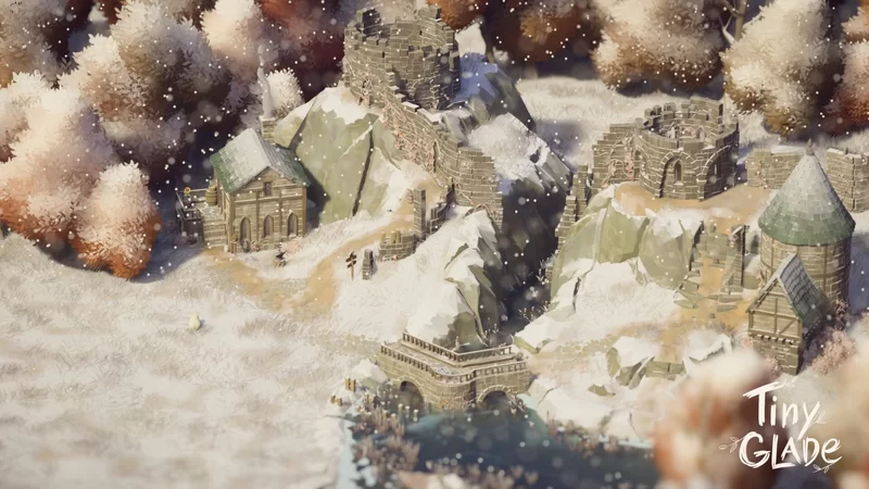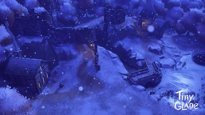 Two modest timber-framed houses huddle beneath the crumbling remnants of what was once a mighty watch. The ancient stone towers stand like weathered giants, their battlements broken and walls worn thin by centuries of harsh winters, while snow gathers in the cracks and crevices of forgotten masonry. The inhabited dwellings nestle almost apologetically among these decaying sentinels, their warm lights and rising chimney smoke a stark contrast to the cold, empty shells of the turrets that loom protectively—or perhaps ominously—overhead. It is a place where practicality has trumped glory, where settlers have claimed the ruins not to restore them, but to shelter in their lee, maintaining their simple homes while the proud towers continue their slow surrender to time and the elements.